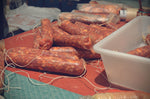 Submerse each casing in cool water or wine until soft, slide the casing on to your filling funnel ready to fill.